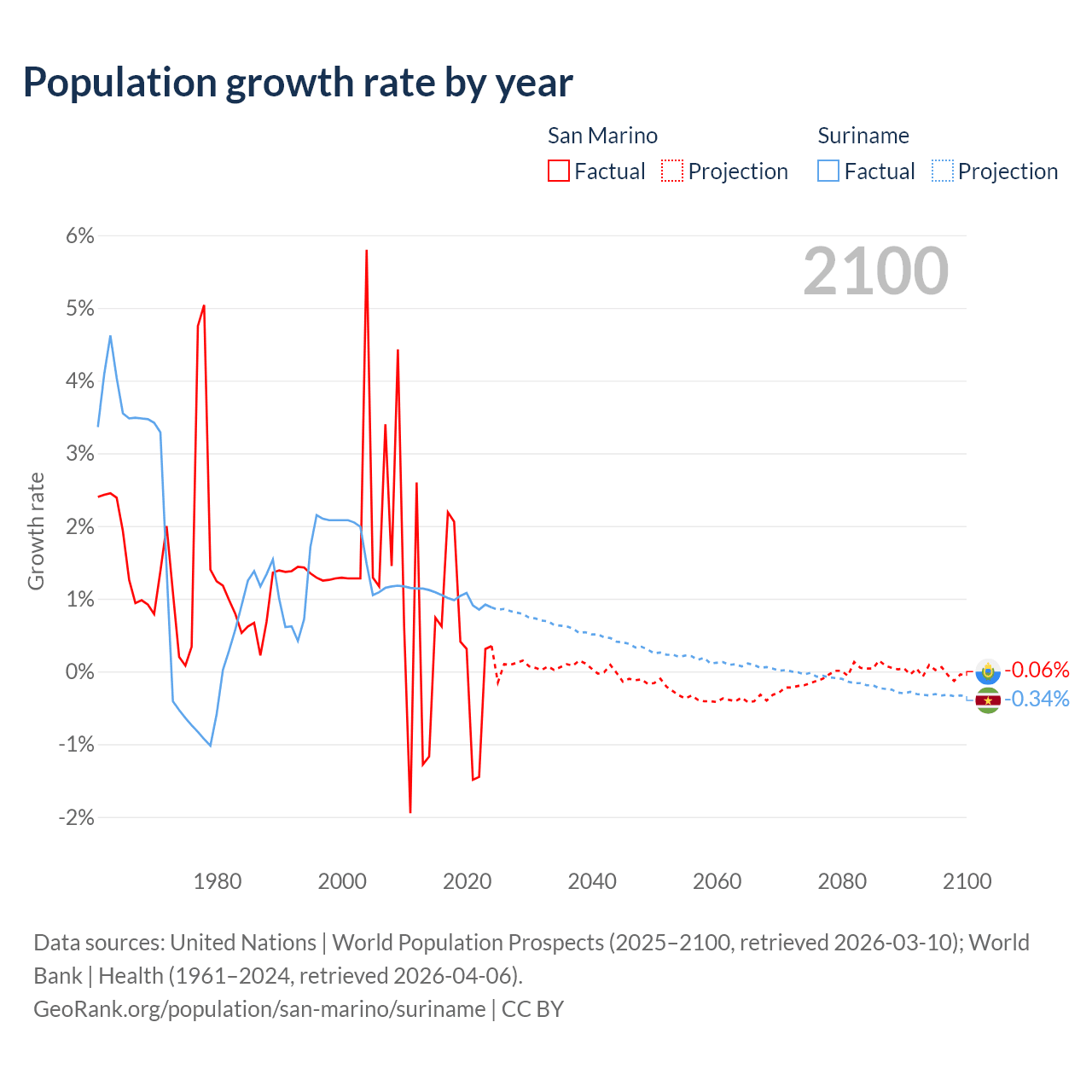 - For the last 10 years, San Marino has had an average growth rate of +0.26% per year vs +0.99% in Suriname.