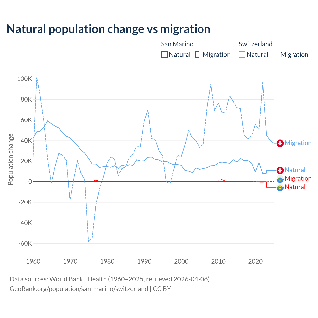 Over the last 10 years, 40.9% of the population change in San Marino is from natural causes (a loss of 358 people) and 59.1% is from migration (a gain of 517 people). In Switzerland 21.6% is from natural causes (a gain of 165,354 people) and 78.4% is from migration (a gain of 600,145 people).
