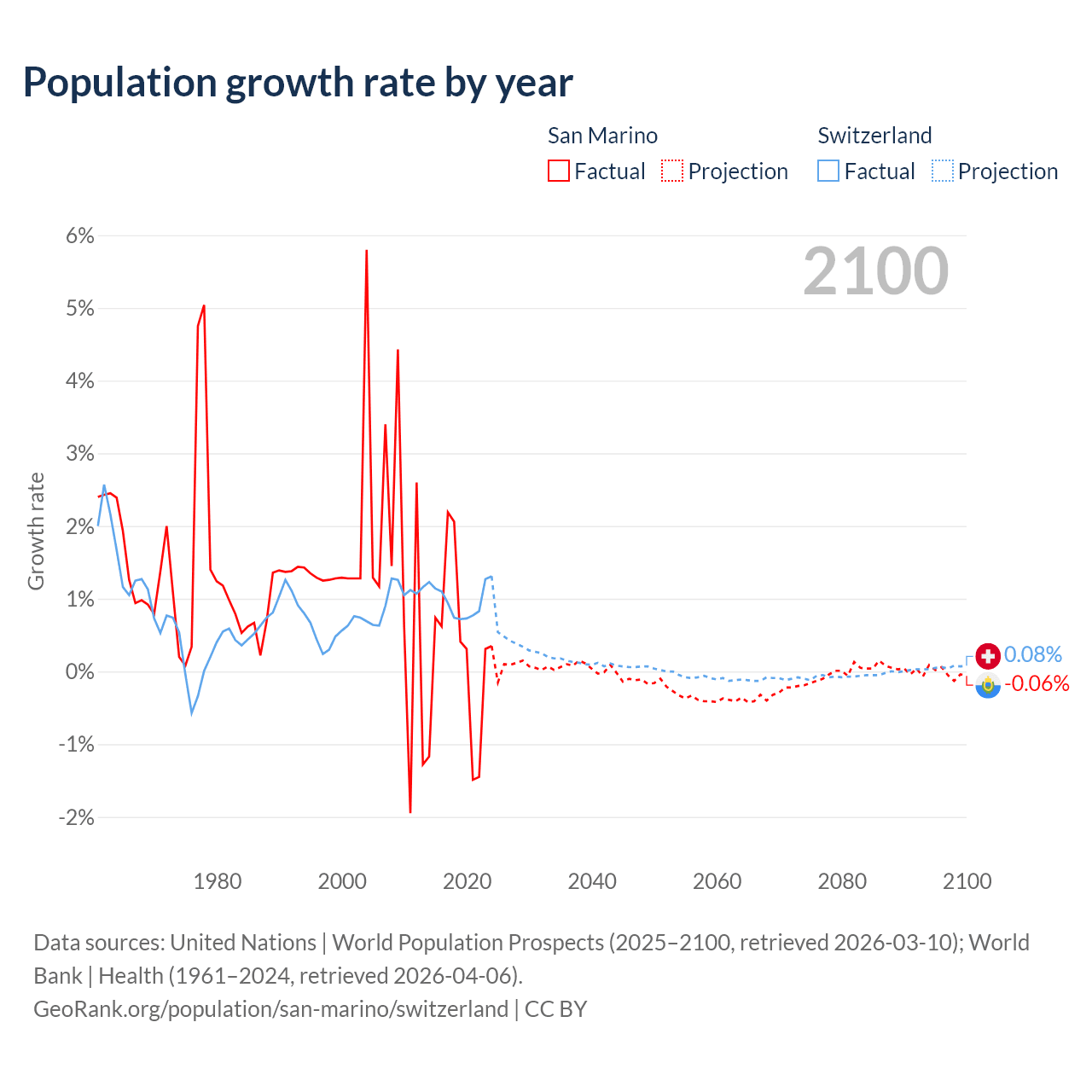 - For the last 10 years, San Marino has had an average growth rate of +0.26% per year vs +0.98% in Switzerland.