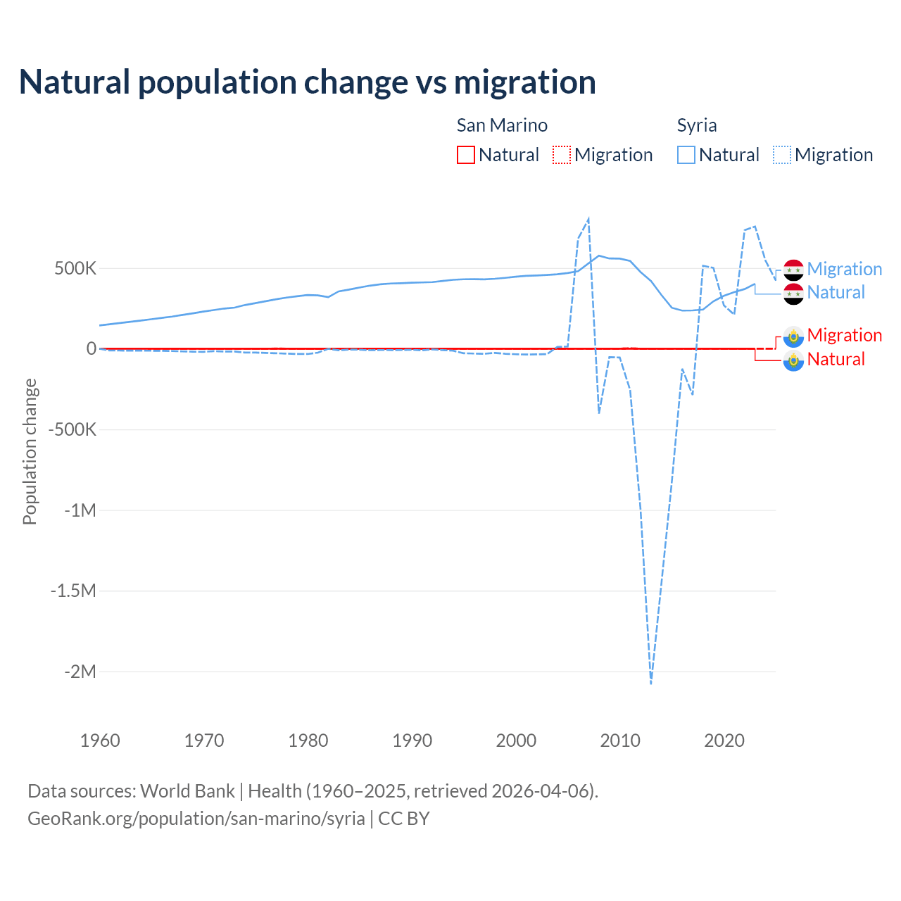 Over the last 10 years, 40.9% of the population change in San Marino is from natural causes (a loss of 358 people) and 59.1% is from migration (a gain of 517 people). In Syria 91.3% is from natural causes (a gain of 3,047,621 people) and 8.72% is from migration (a gain of 291,069 people).