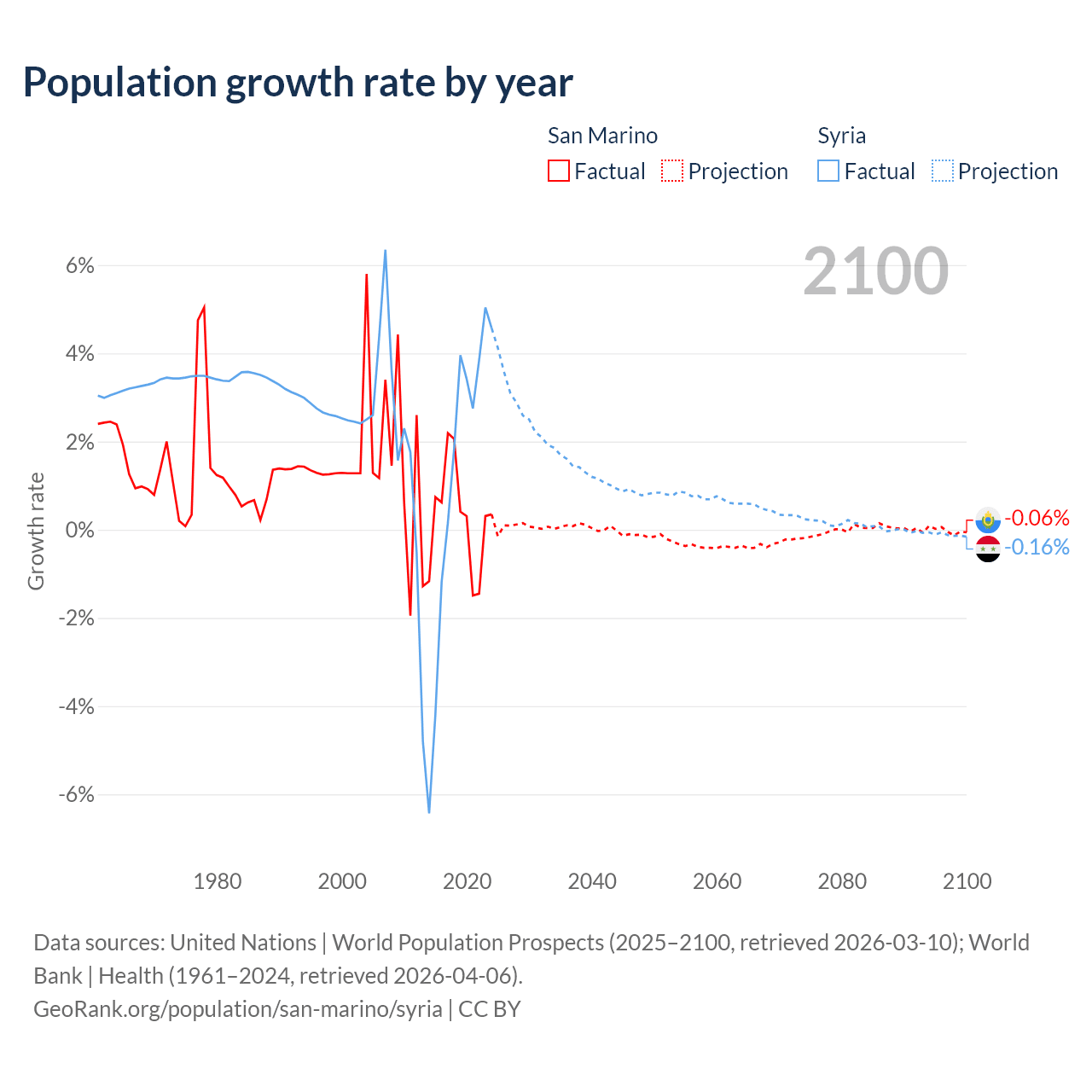- For the last 10 years, San Marino has had an average growth rate of +0.26% per year vs +1.25% in Syria.