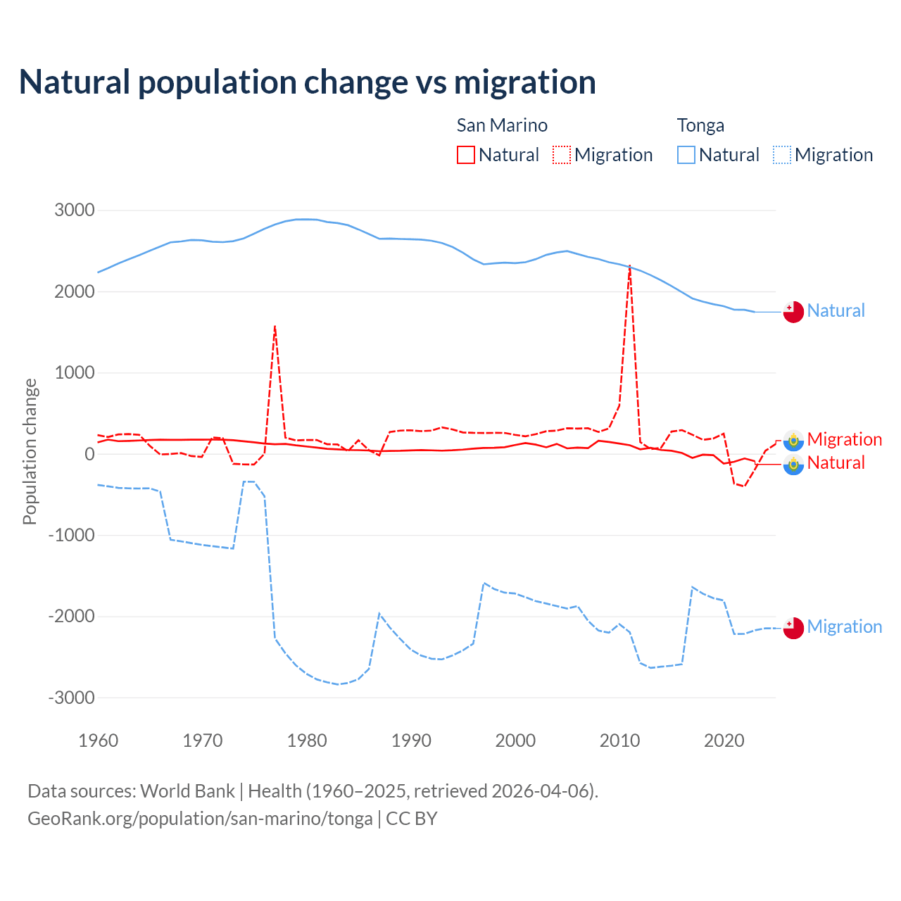 Over the last 10 years, 40.9% of the population change in San Marino is from natural causes (a loss of 358 people) and 59.1% is from migration (a gain of 517 people). In Tonga 46.9% is from natural causes (a gain of 18,919 people) and 53.1% is from migration (a loss of 21,384 people).
