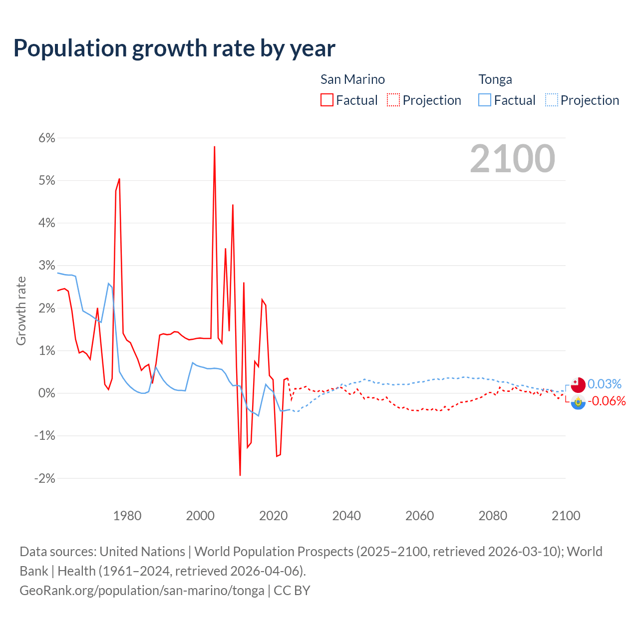 - For the last 10 years, San Marino has had an average growth rate of +0.26% per year vs -0.25% in Tonga.