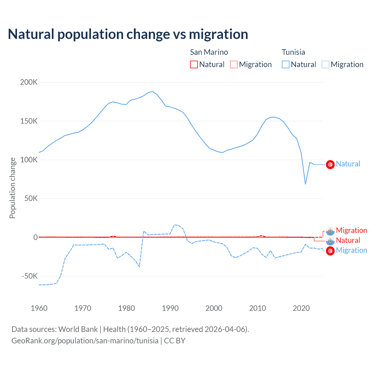 Over the last 10 years, 40.9% of the population change in San Marino is from natural causes (a loss of 358 people) and 59.1% is from migration (a gain of 517 people). In Tunisia 86.3% is from natural causes (a gain of 1,225,079 people) and 13.7% is from migration (a loss of 195,011 people).