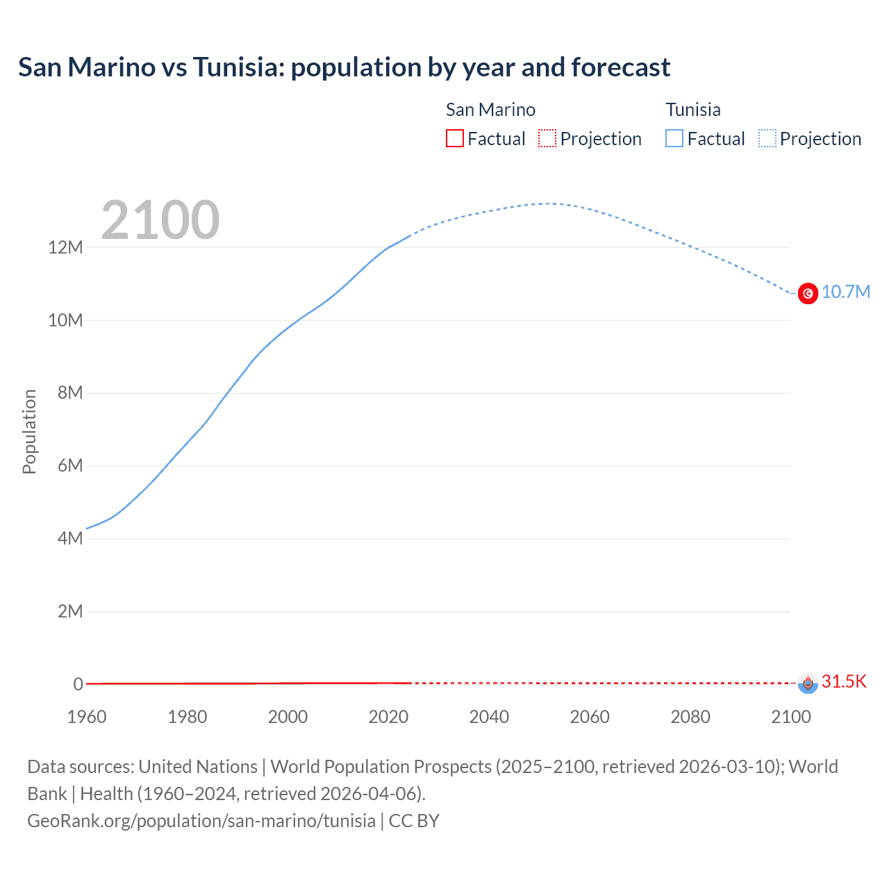 The latest officially reported population of San Marino was 33,977 in 2024 vs 12,277,109 people in Tunisia in 2024. In 2026, based on the adjusted UN estimation, the current San Marino's population is 33,967 people compared to 12,437,803 in Tunisia.