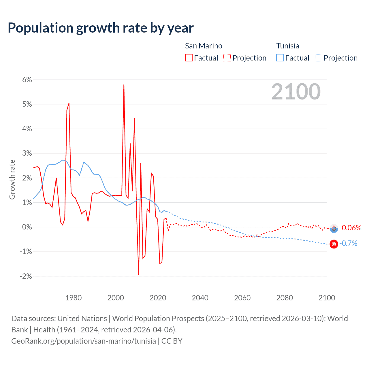- For the last 10 years, San Marino has had an average growth rate of +0.26% per year vs +0.89% in Tunisia.
