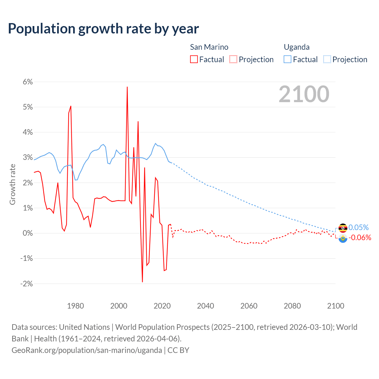 - For the last 10 years, San Marino has had an average growth rate of +0.26% per year vs +3.21% in Uganda.