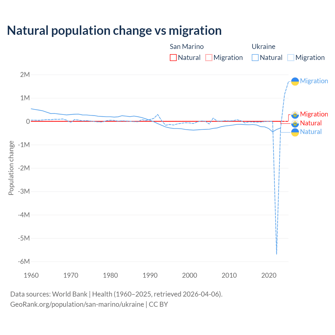 Over the last 10 years, 40.9% of the population change in San Marino is from natural causes (a loss of 358 people) and 59.1% is from migration (a gain of 517 people). In Ukraine 28.2% is from natural causes (a loss of 2,435,153 people) and 71.8% is from migration (a loss of 6,198,995 people).