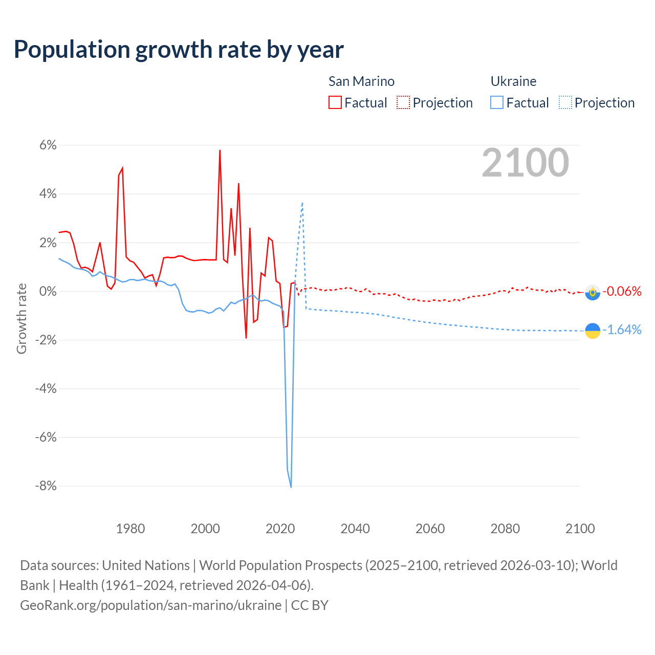 - For the last 10 years, San Marino has had an average growth rate of +0.26% per year vs -1.74% in Ukraine.