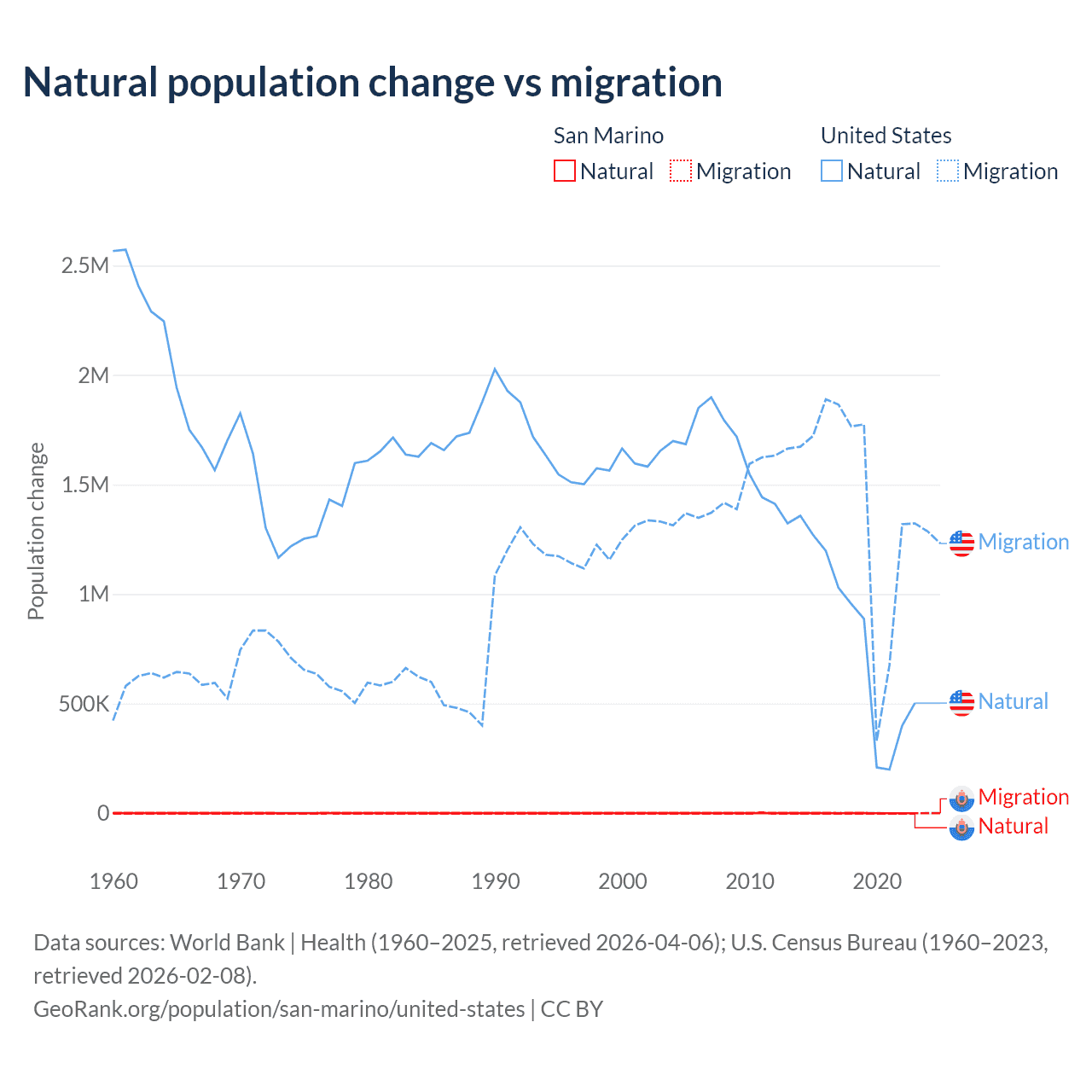 Over the last 10 years, 40.9% of the population change in San Marino is from natural causes (a loss of 358 people) and 59.1% is from migration (a gain of 517 people). In the United States 35.8% is from natural causes (a gain of 8,005,866 people) and 64.2% is from migration (a gain of 14,334,286 people).