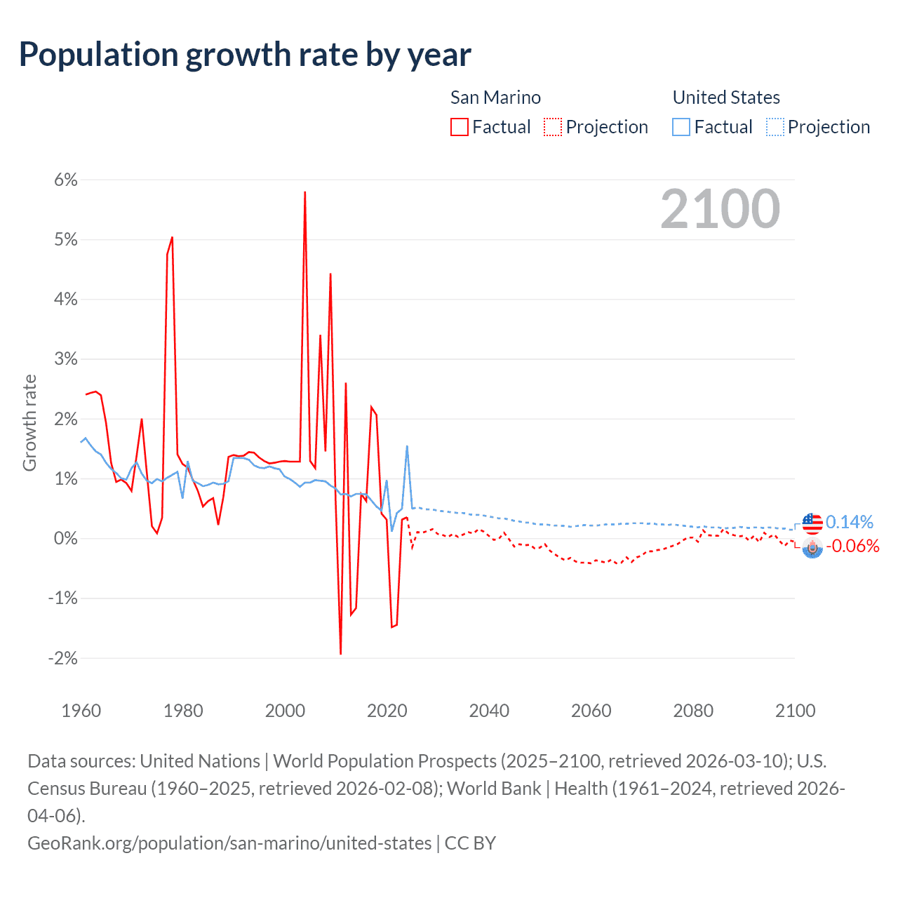 Data sources: World Bank | Health (1960–2024, retrieved 2026-04-06); United Nations | World Population Prospects (1960–2026, retrieved 2026-03-10); U.S. Census Bureau (1960–2025, retrieved 2026-02-08); Central Intelligence Agency (CIA) (2000–2019, retrieved 2026-02-20).