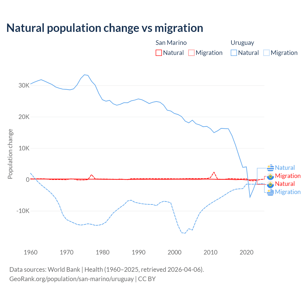 Over the last 10 years, 40.9% of the population change in San Marino is from natural causes (a loss of 358 people) and 59.1% is from migration (a gain of 517 people). In Uruguay 70% is from natural causes (a gain of 64,303 people) and 30% is from migration (a loss of 27,501 people).
