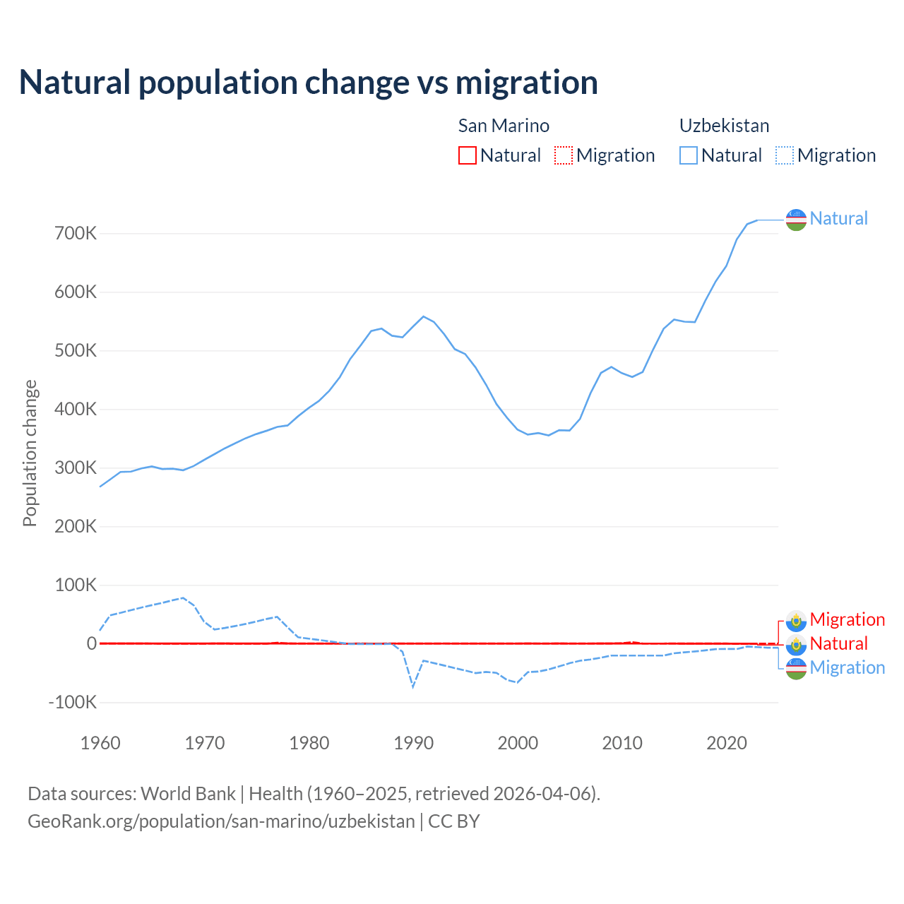 Over the last 10 years, 40.9% of the population change in San Marino is from natural causes (a loss of 358 people) and 59.1% is from migration (a gain of 517 people). In Uzbekistan 98.2% is from natural causes (a gain of 6,161,117 people) and 1.84% is from migration (a loss of 115,398 people).