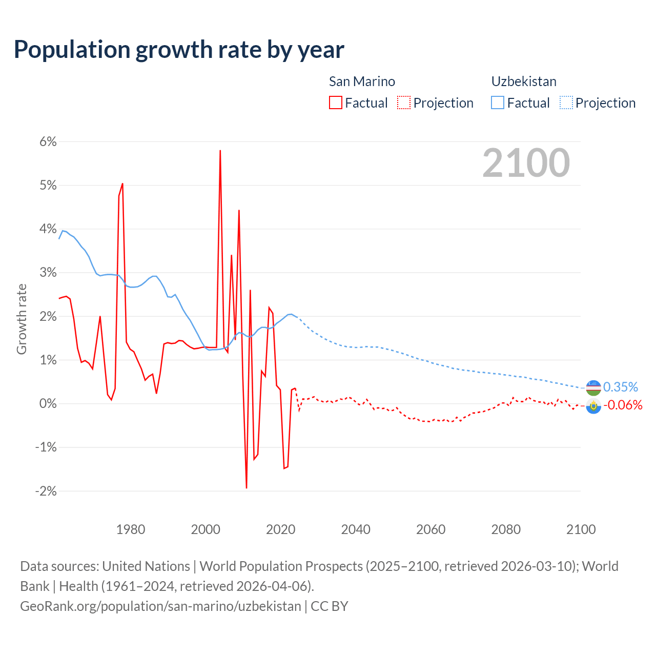- For the last 10 years, San Marino has had an average growth rate of +0.26% per year vs +1.85% in Uzbekistan.
