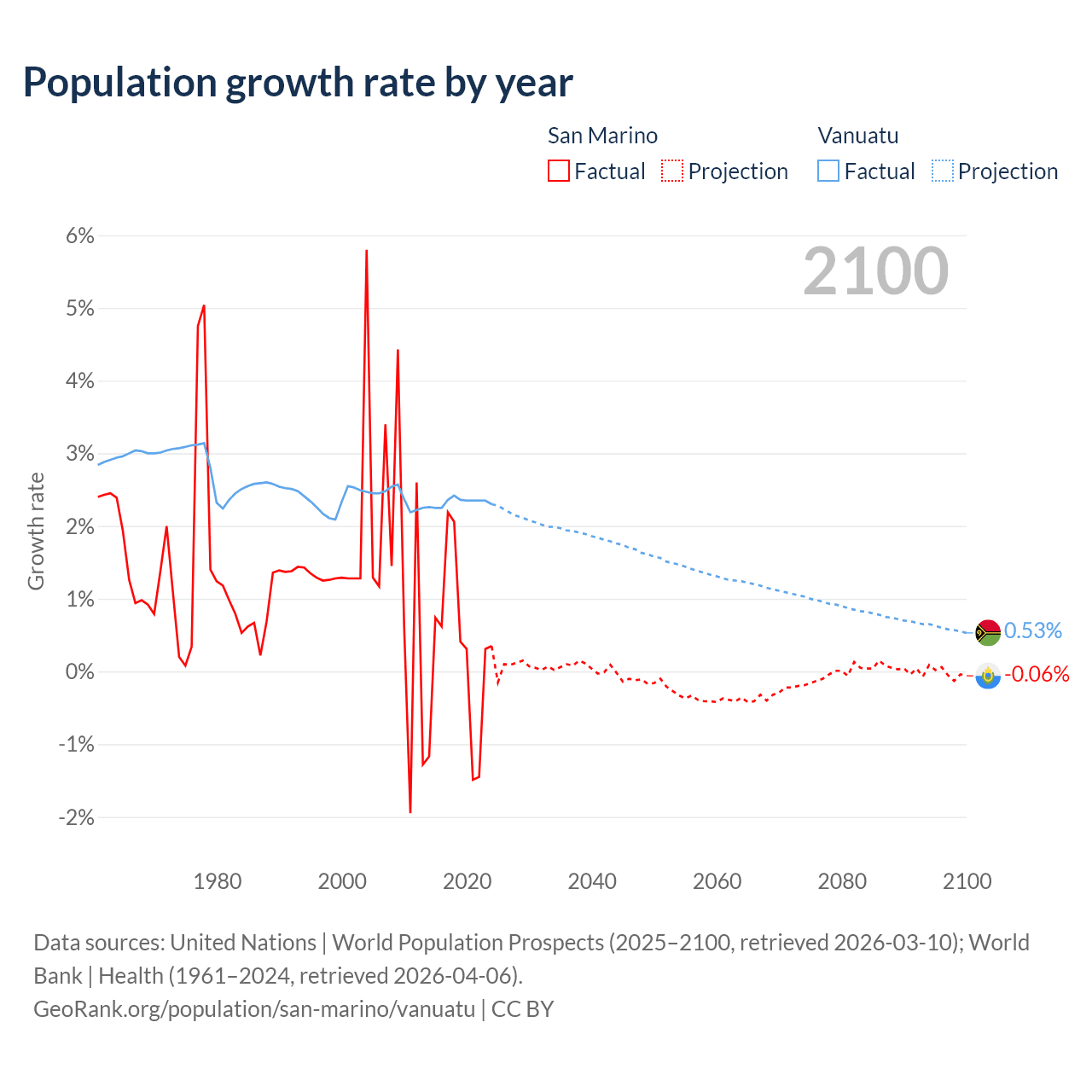 - For the last 10 years, San Marino has had an average growth rate of +0.26% per year vs +2.33% in Vanuatu.