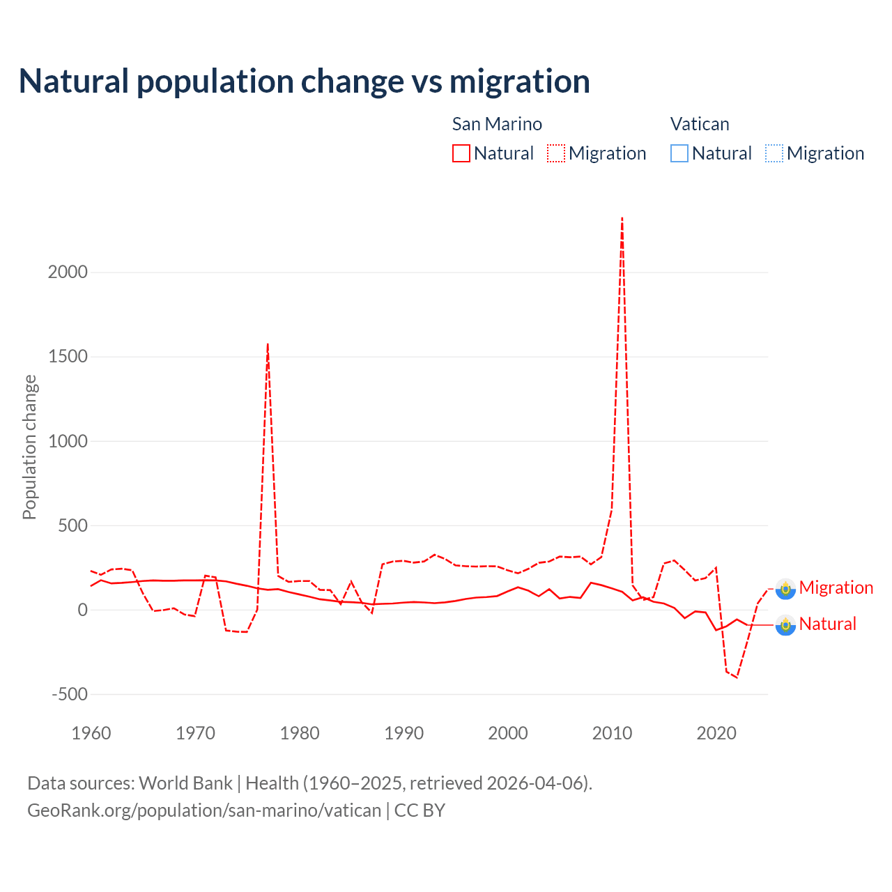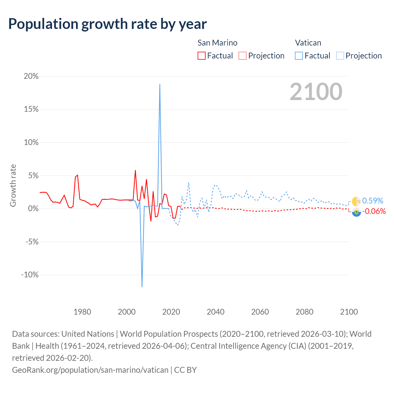 - For the last 10 years, San Marino has had an average growth rate of +0.26% per year vs +1.9% in the Vatican.
