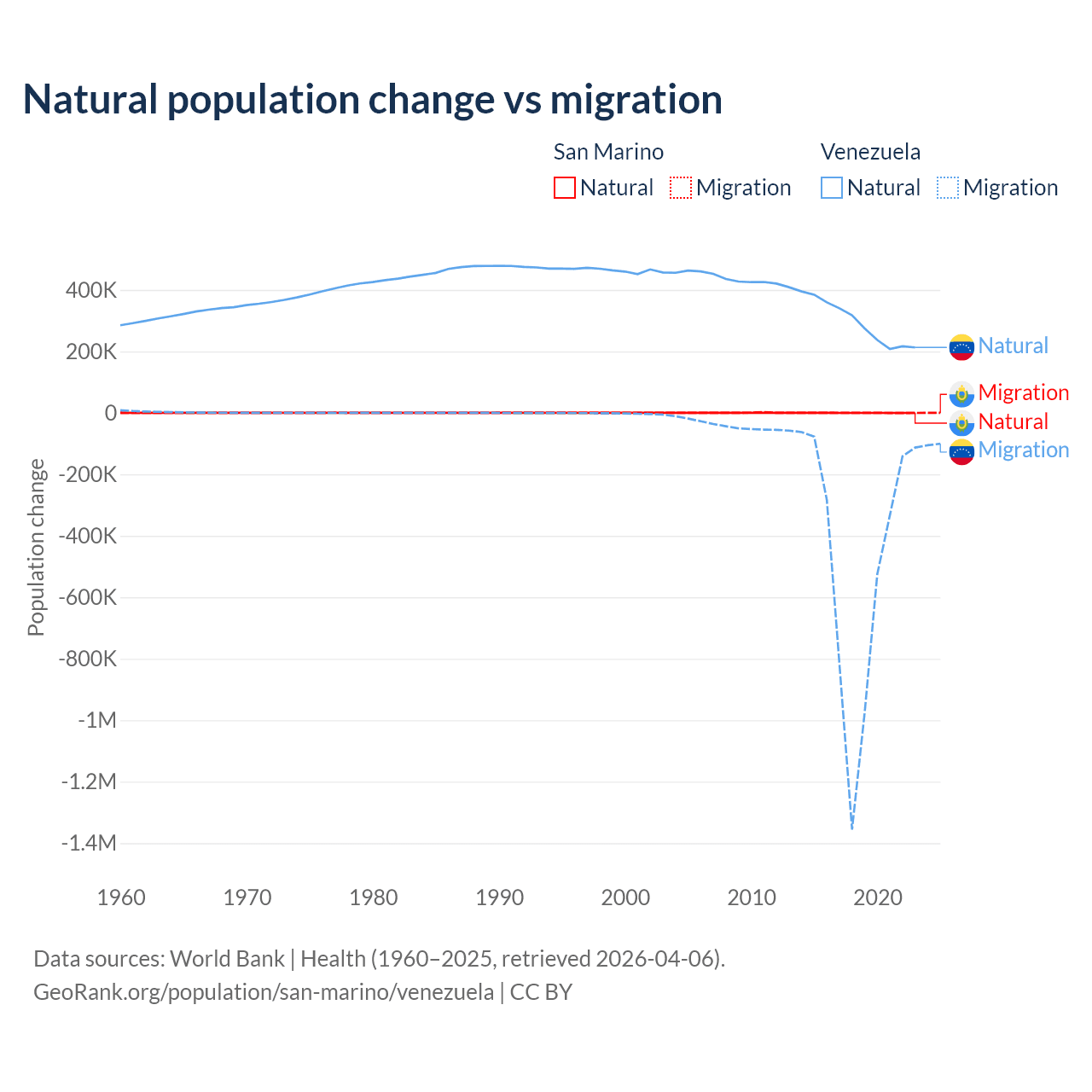 Over the last 10 years, 40.9% of the population change in San Marino is from natural causes (a loss of 358 people) and 59.1% is from migration (a gain of 517 people). In Venezuela 38.6% is from natural causes (a gain of 2,946,257 people) and 61.4% is from migration (a loss of 4,683,227 people).