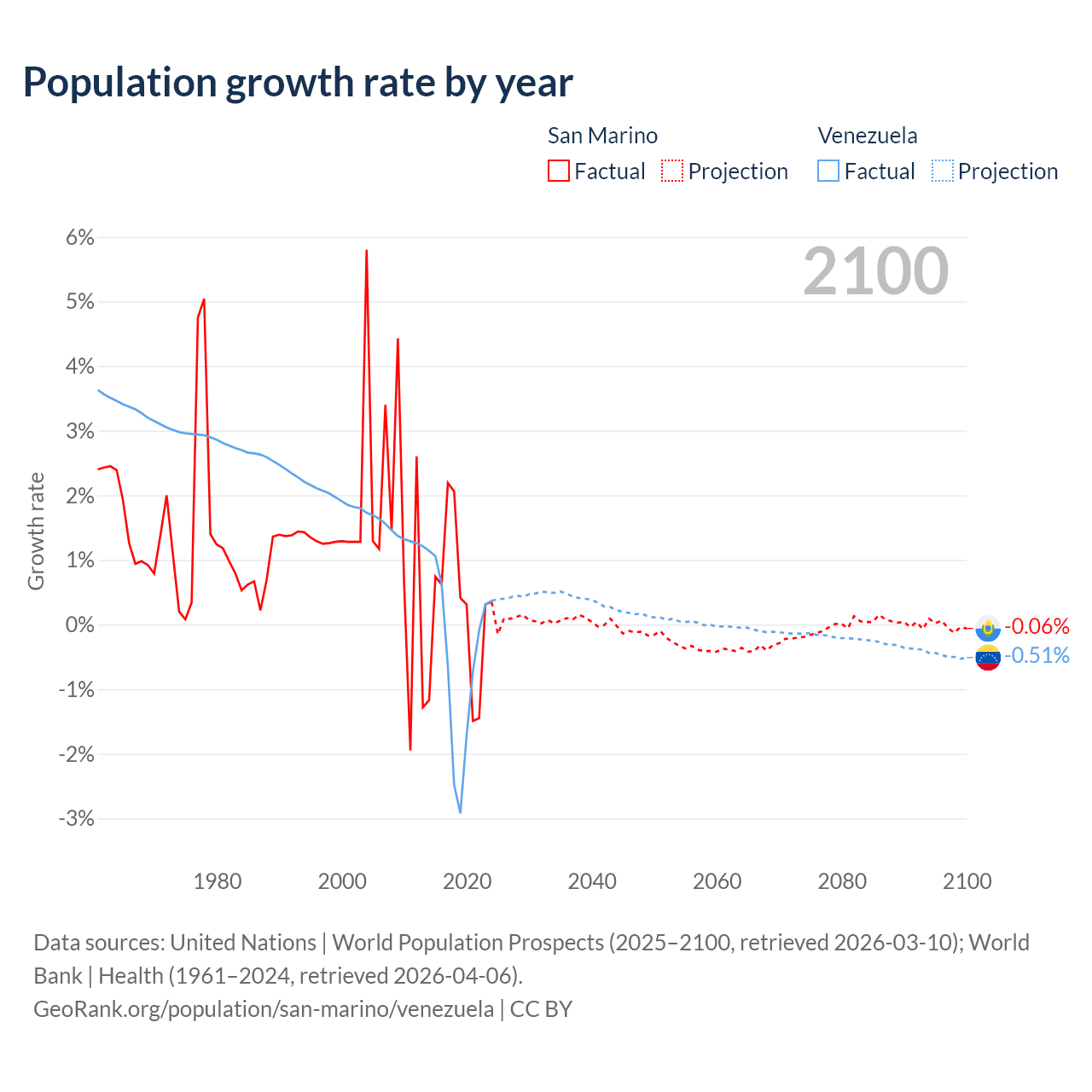 - For the last 10 years, San Marino has had an average growth rate of +0.26% per year vs -0.46% in Venezuela.