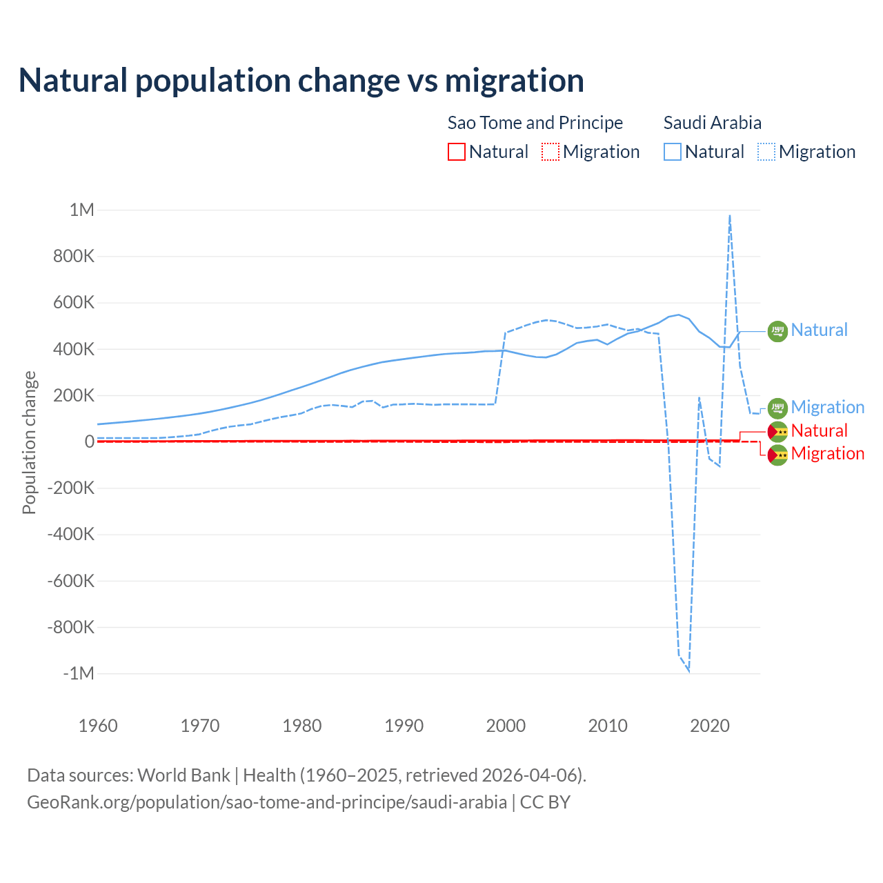 Over the last 10 years, 80.1% of the population change in Sao Tome and Principe is from natural causes (a gain of 50,822 people) and 19.9% is from migration (a loss of 12,621 people). In Saudi Arabia 93.9% is from natural causes (a gain of 4,829,562 people) and 6.05% is from migration (a gain of 311,209 people).
