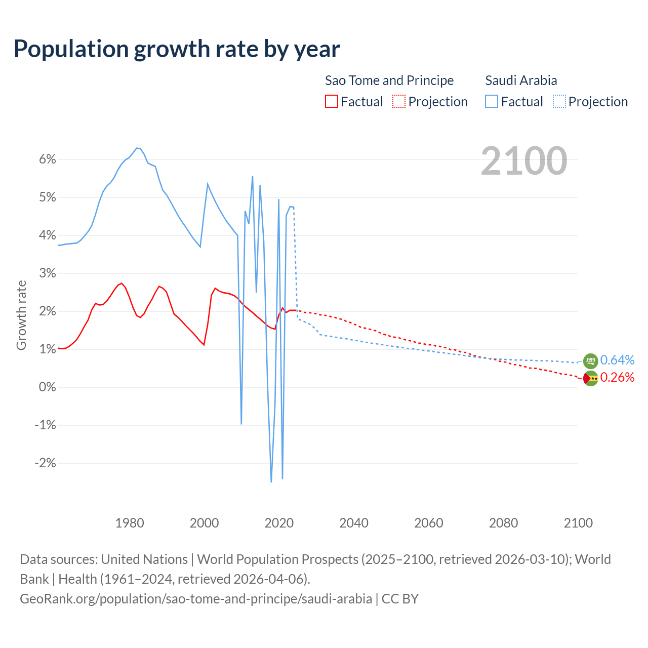 - For the last 10 years, Sao Tome and Principe has had an average growth rate of +1.82% per year vs +2.3% in Saudi Arabia.