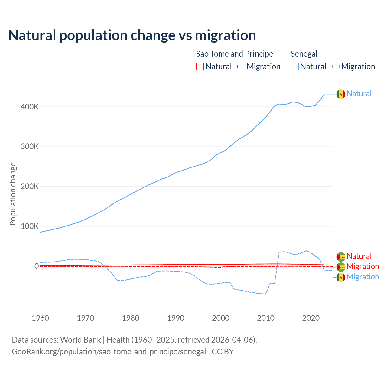 Over the last 10 years, 80.1% of the population change in Sao Tome and Principe is from natural causes (a gain of 50,822 people) and 19.9% is from migration (a loss of 12,621 people). In Senegal 93.9% is from natural causes (a gain of 4,089,205 people) and 6.13% is from migration (a gain of 267,266 people).