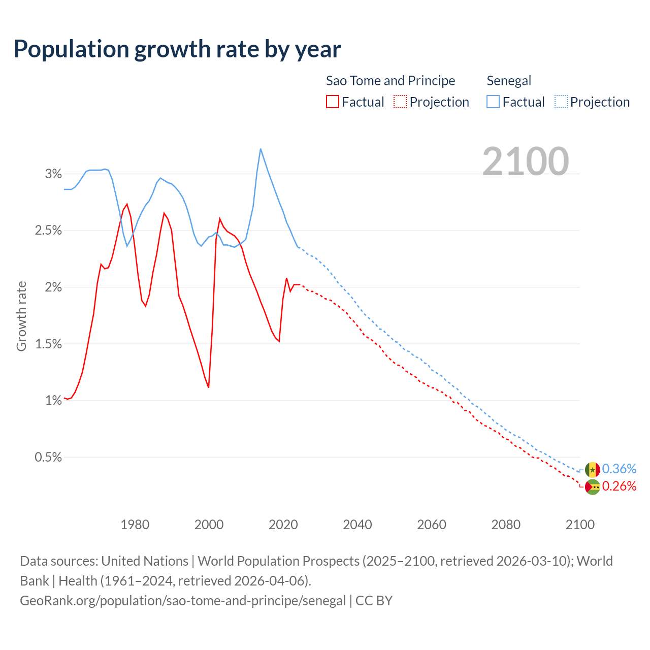 - For the last 10 years, Sao Tome and Principe has had an average growth rate of +1.82% per year vs +2.76% in Senegal.