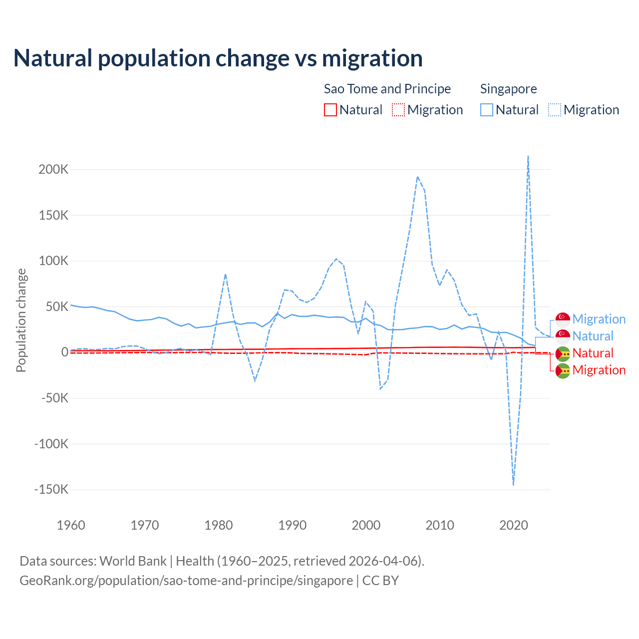 Over the last 10 years, 80.1% of the population change in Sao Tome and Principe is from natural causes (a gain of 50,822 people) and 19.9% is from migration (a loss of 12,621 people). In Singapore 54.8% is from natural causes (a gain of 195,953 people) and 45.2% is from migration (a gain of 161,805 people).