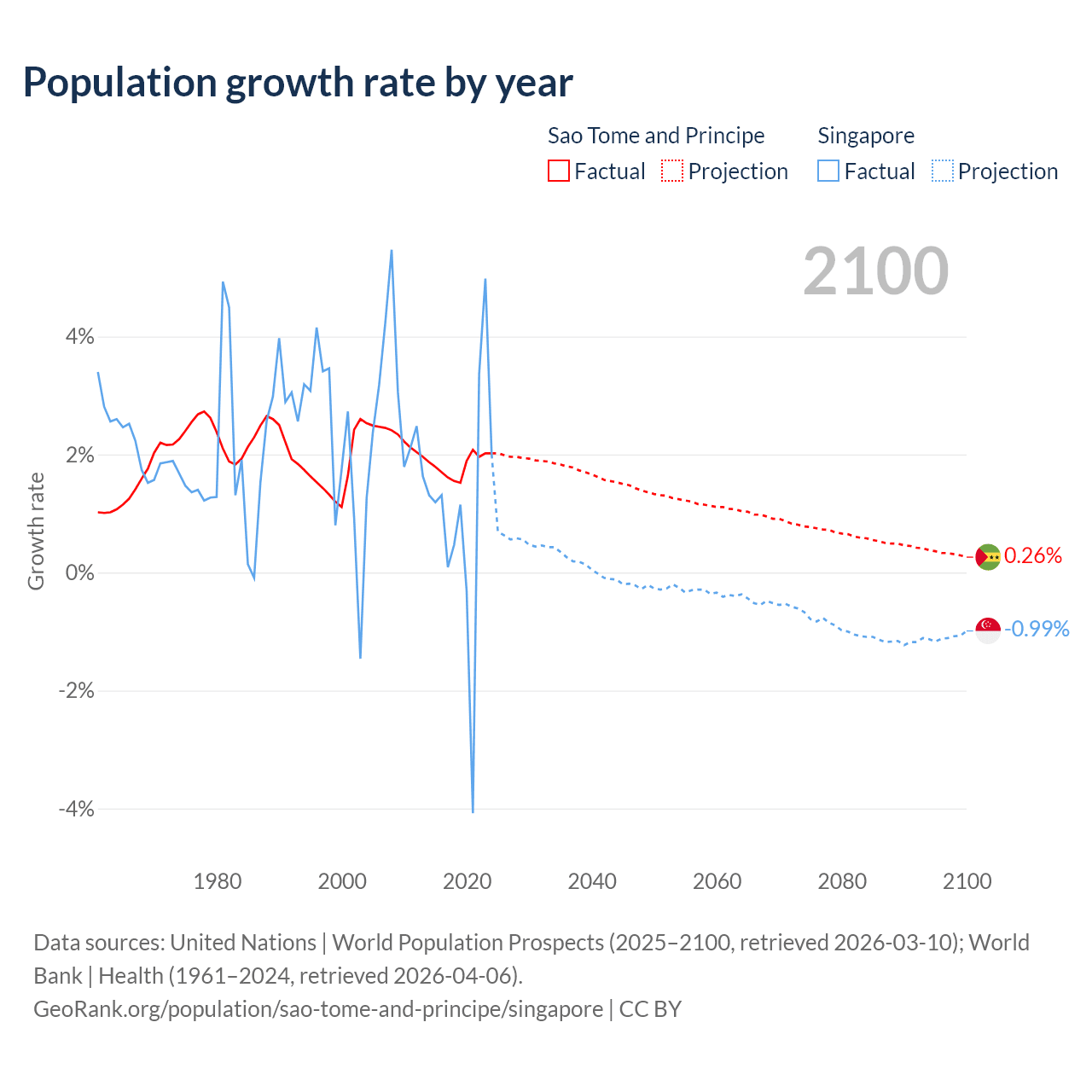 - For the last 10 years, Sao Tome and Principe has had an average growth rate of +1.82% per year vs +1.04% in Singapore.