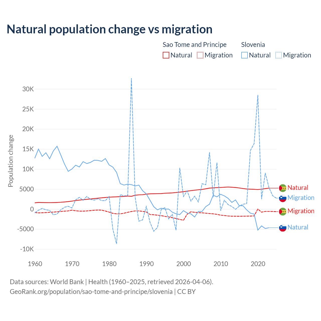 Over the last 10 years, 80.1% of the population change in Sao Tome and Principe is from natural causes (a gain of 50,822 people) and 19.9% is from migration (a loss of 12,621 people). In Slovenia 18.1% is from natural causes (a loss of 17,573 people) and 81.9% is from migration (a gain of 79,532 people).