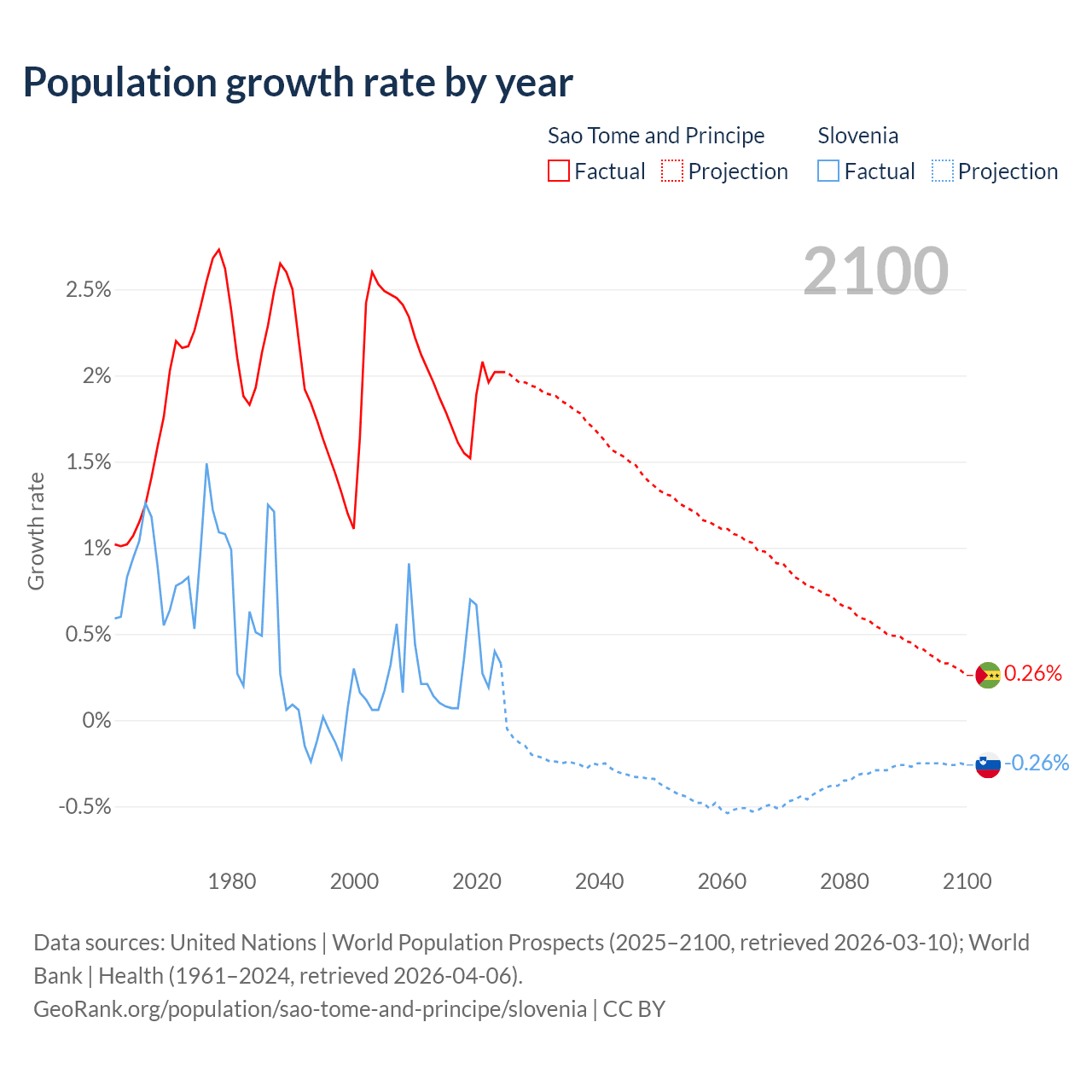 - For the last 10 years, Sao Tome and Principe has had an average growth rate of +1.82% per year vs +0.29% in Slovenia.