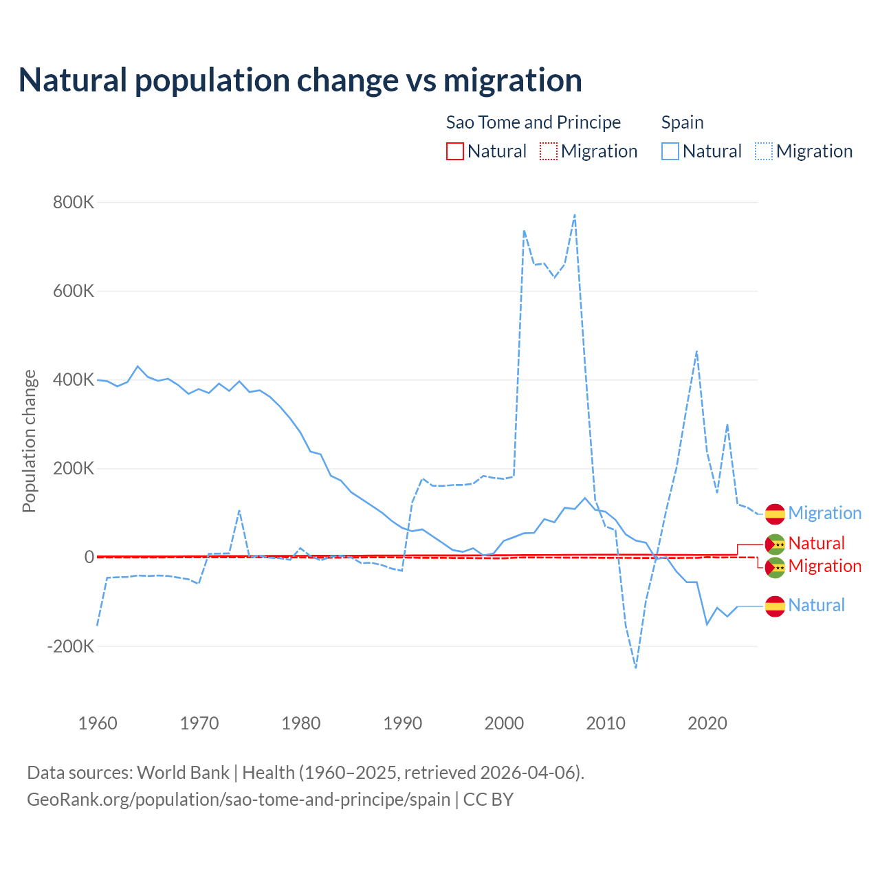 Over the last 10 years, 80.1% of the population change in Sao Tome and Principe is from natural causes (a gain of 50,822 people) and 19.9% is from migration (a loss of 12,621 people). In Spain 25.8% is from natural causes (a loss of 627,829 people) and 74.2% is from migration (a gain of 1,810,127 people).