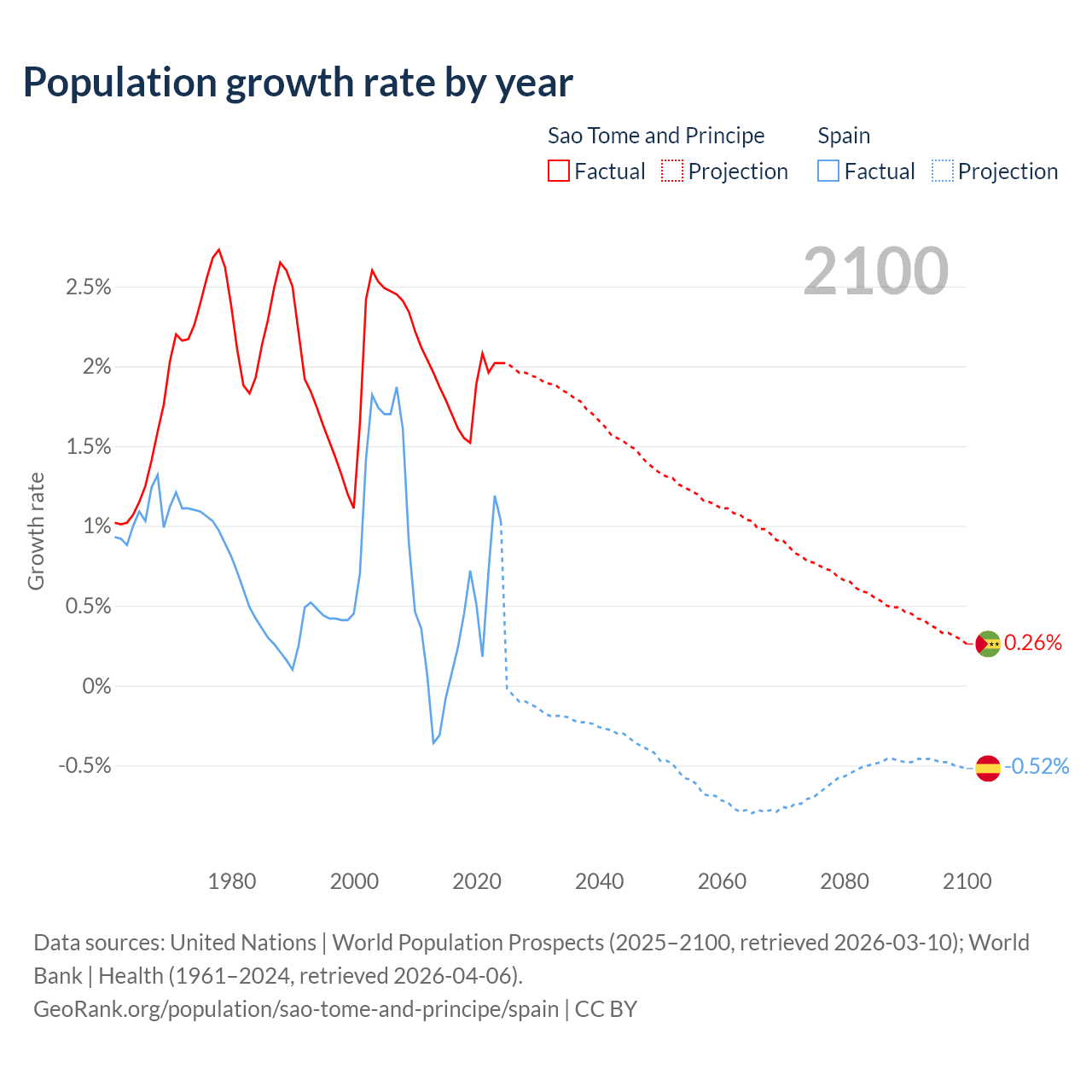 - For the last 10 years, Sao Tome and Principe has had an average growth rate of +1.82% per year vs +0.43% in Spain.