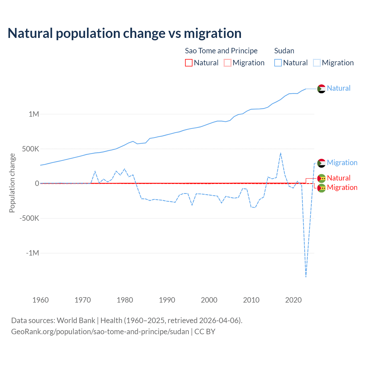 Over the last 10 years, 80.1% of the population change in Sao Tome and Principe is from natural causes (a gain of 50,822 people) and 19.9% is from migration (a loss of 12,621 people). In Sudan 95.1% is from natural causes (a gain of 12,459,977 people) and 4.88% is from migration (a loss of 639,596 people).