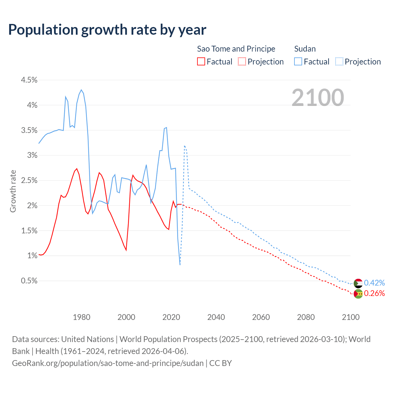 - For the last 10 years, Sao Tome and Principe has had an average growth rate of +1.82% per year vs +2.67% in Sudan.