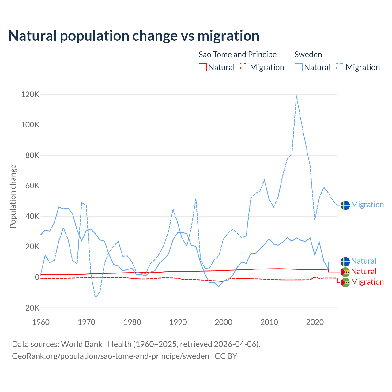 Over the last 10 years, 80.1% of the population change in Sao Tome and Principe is from natural causes (a gain of 50,822 people) and 19.9% is from migration (a loss of 12,621 people). In Sweden 21.4% is from natural causes (a gain of 201,900 people) and 78.6% is from migration (a gain of 743,642 people).