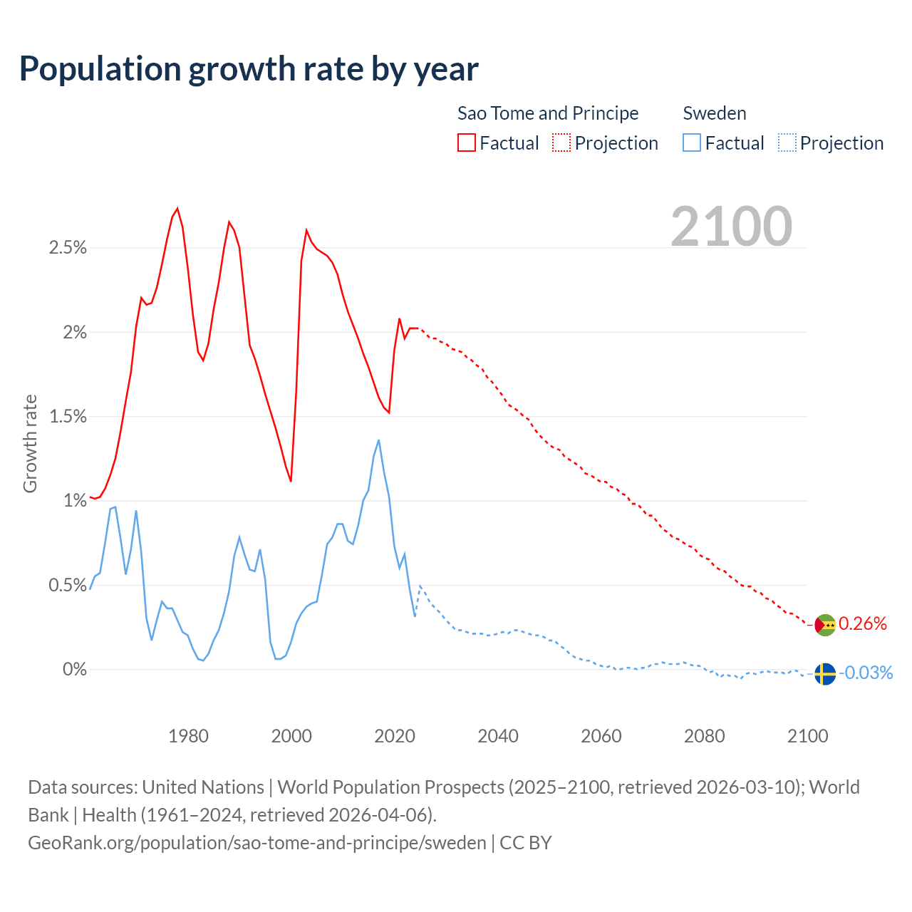 - For the last 10 years, Sao Tome and Principe has had an average growth rate of +1.82% per year vs +0.88% in Sweden.