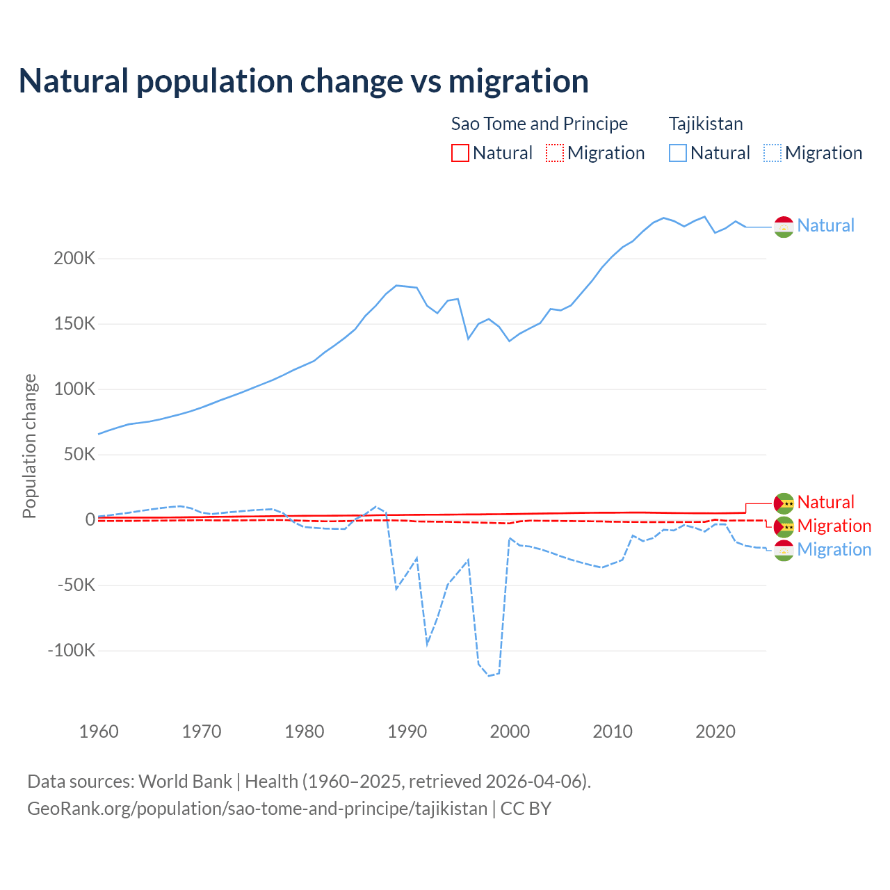 Over the last 10 years, 80.1% of the population change in Sao Tome and Principe is from natural causes (a gain of 50,822 people) and 19.9% is from migration (a loss of 12,621 people). In Tajikistan 96% is from natural causes (a gain of 2,266,045 people) and 3.95% is from migration (a loss of 93,205 people).
