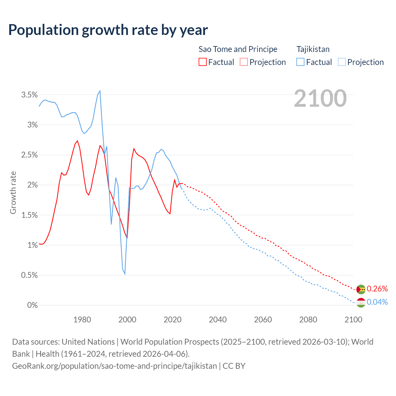 - For the last 10 years, Sao Tome and Principe has had an average growth rate of +1.82% per year vs +2.33% in Tajikistan.