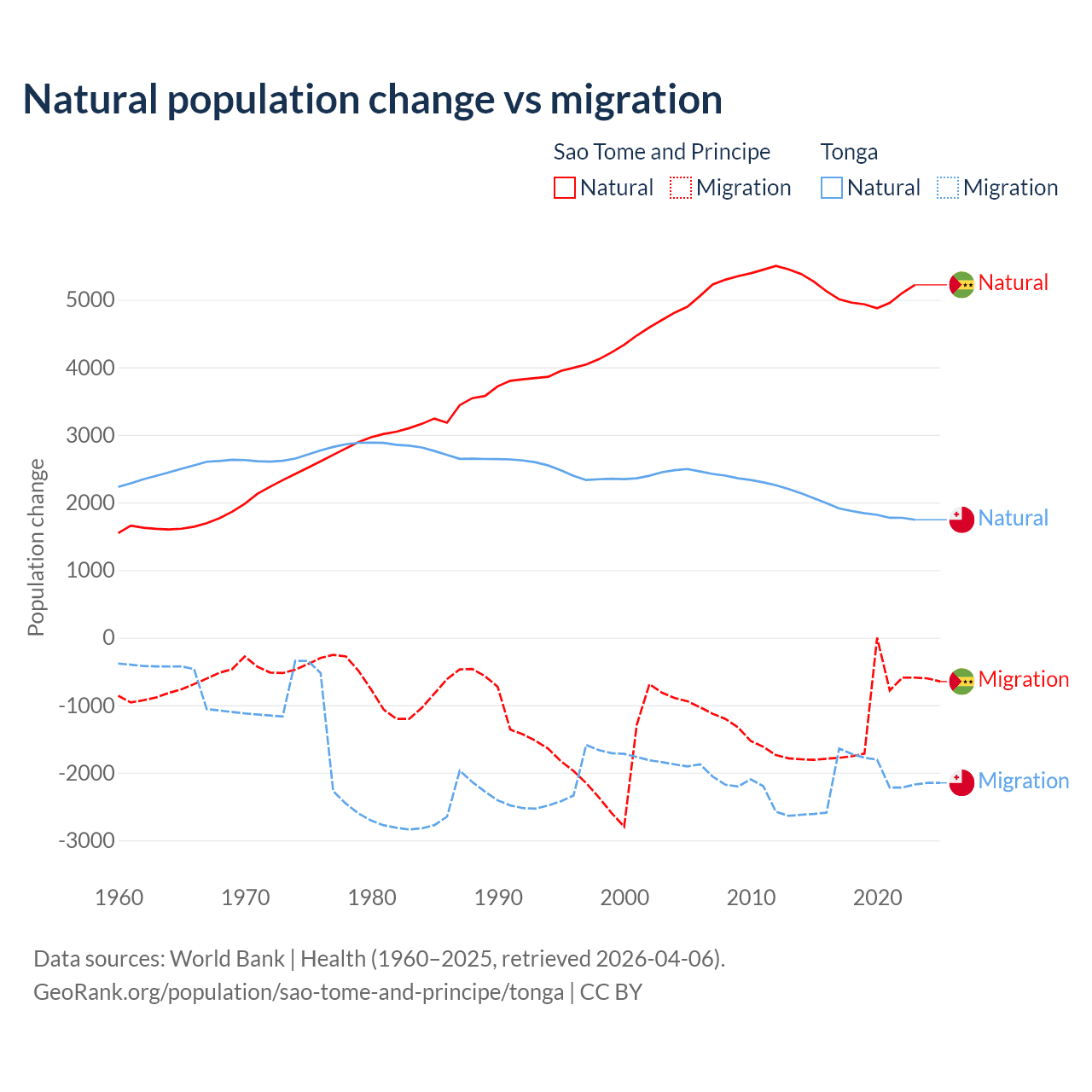 Over the last 10 years, 80.1% of the population change in Sao Tome and Principe is from natural causes (a gain of 50,822 people) and 19.9% is from migration (a loss of 12,621 people). In Tonga 46.9% is from natural causes (a gain of 18,919 people) and 53.1% is from migration (a loss of 21,384 people).