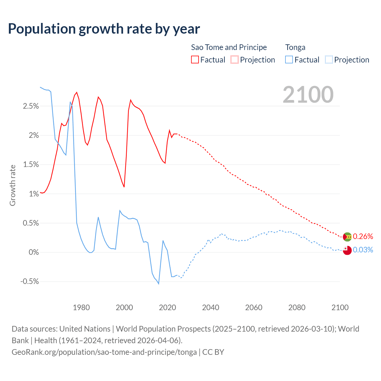 - For the last 10 years, Sao Tome and Principe has had an average growth rate of +1.82% per year vs -0.25% in Tonga.