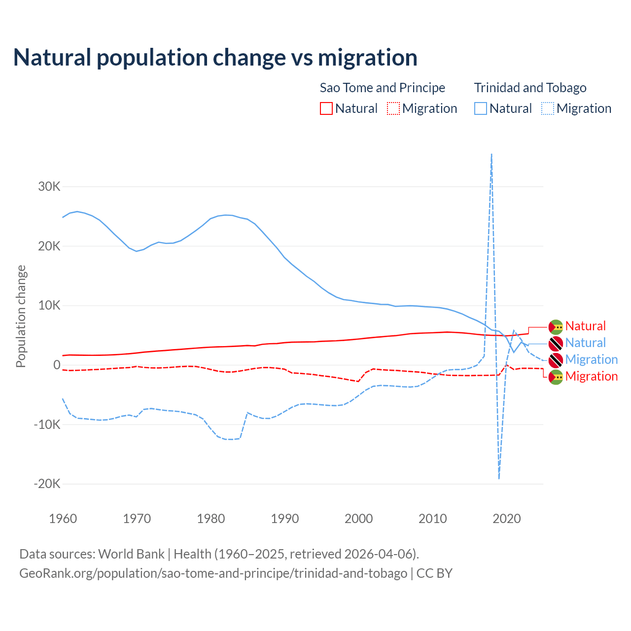 Over the last 10 years, 80.1% of the population change in Sao Tome and Principe is from natural causes (a gain of 50,822 people) and 19.9% is from migration (a loss of 12,621 people). In Trinidad and Tobago 66% is from natural causes (a gain of 55,887 people) and 34% is from migration (a gain of 28,785 people).
