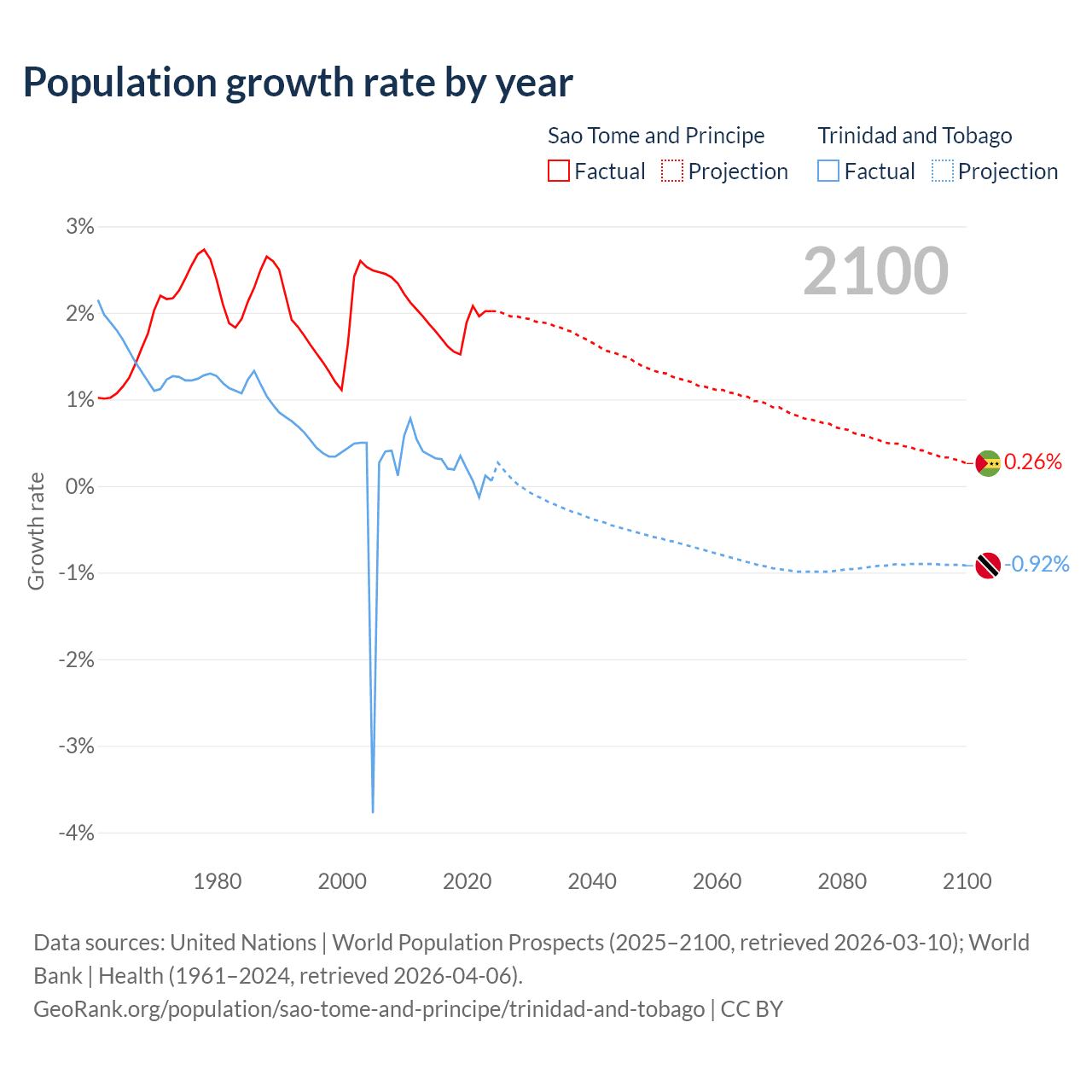 - For the last 10 years, Sao Tome and Principe has had an average growth rate of +1.82% per year vs +0.19% in Trinidad and Tobago.
