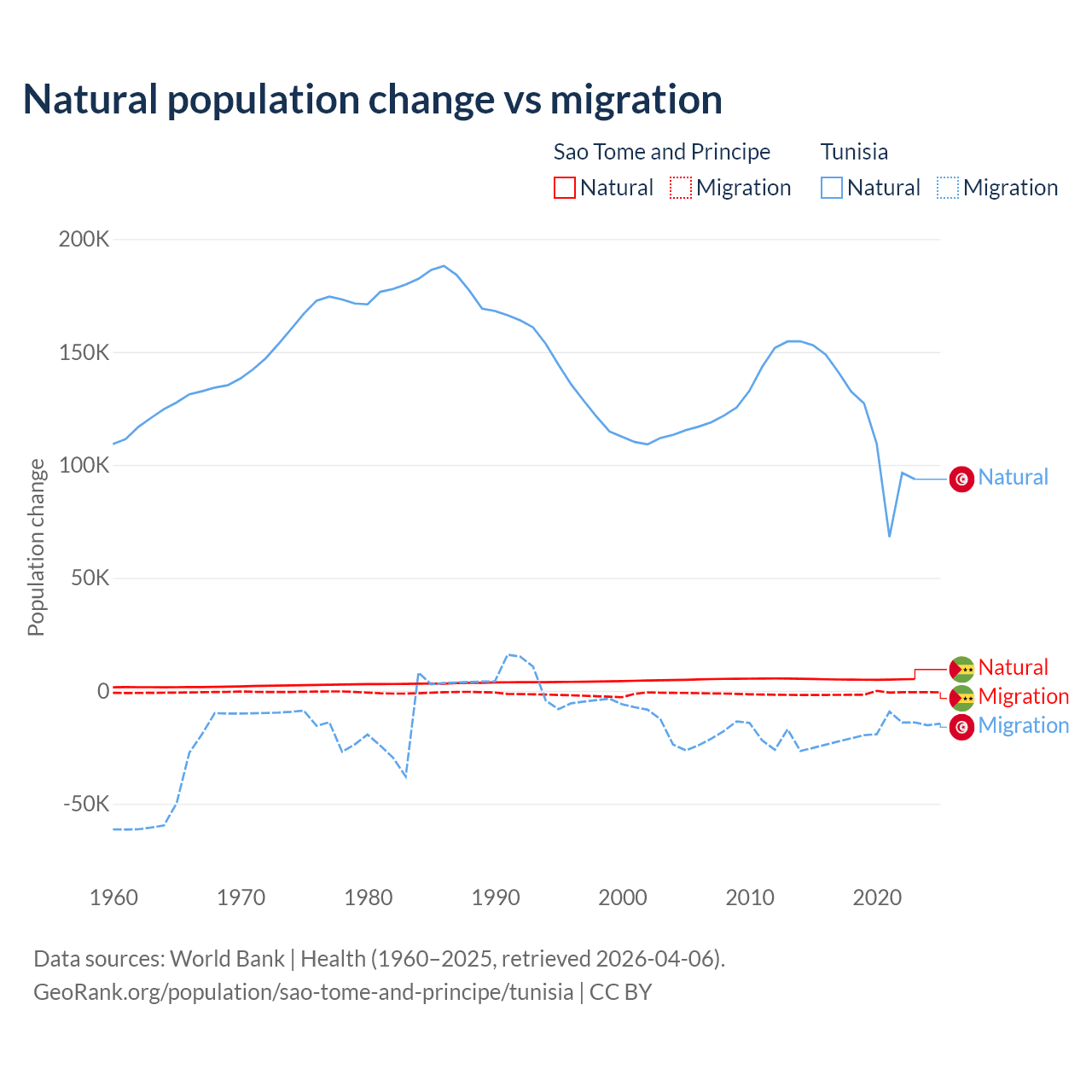 Over the last 10 years, 80.1% of the population change in Sao Tome and Principe is from natural causes (a gain of 50,822 people) and 19.9% is from migration (a loss of 12,621 people). In Tunisia 86.3% is from natural causes (a gain of 1,225,079 people) and 13.7% is from migration (a loss of 195,011 people).