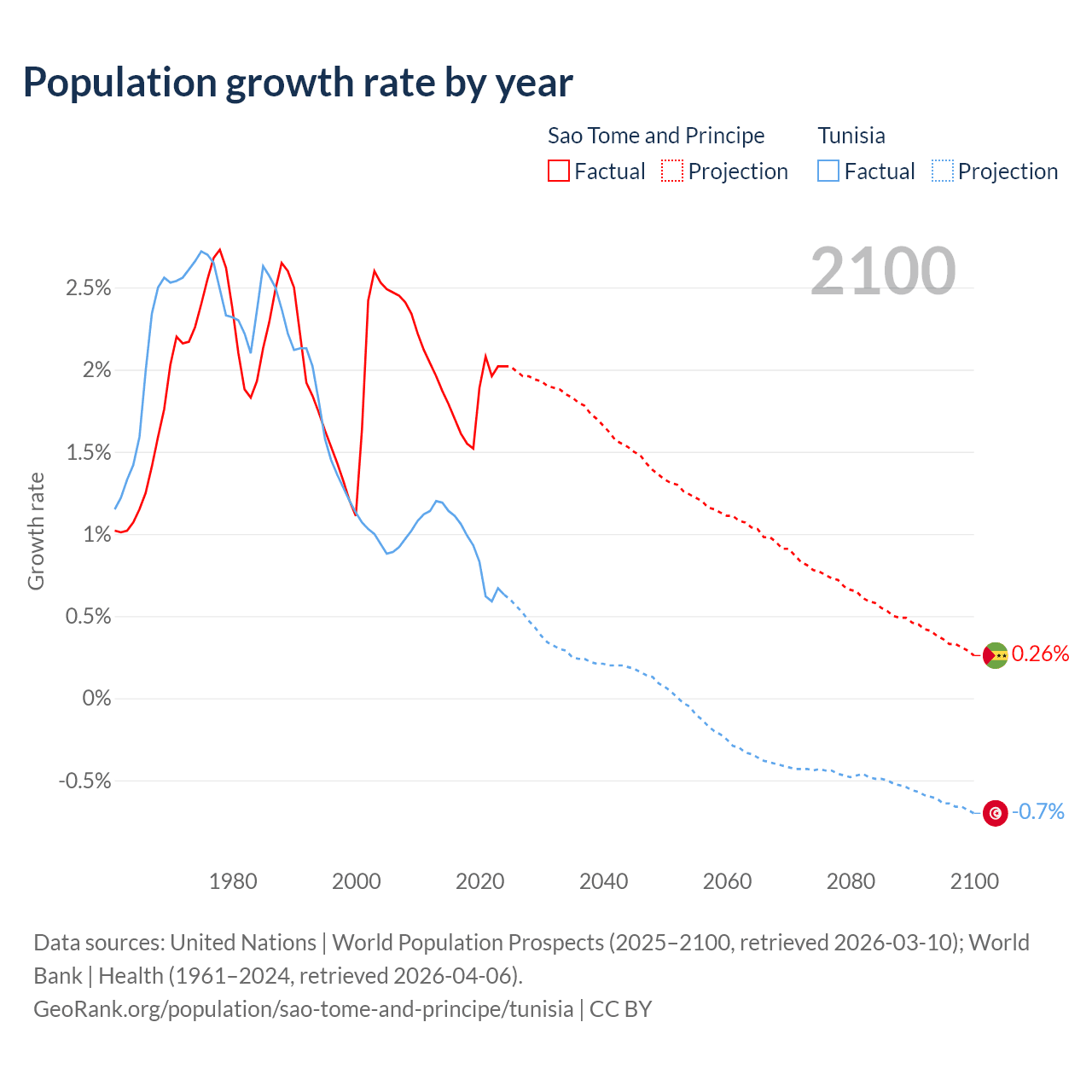 - For the last 10 years, Sao Tome and Principe has had an average growth rate of +1.82% per year vs +0.89% in Tunisia.