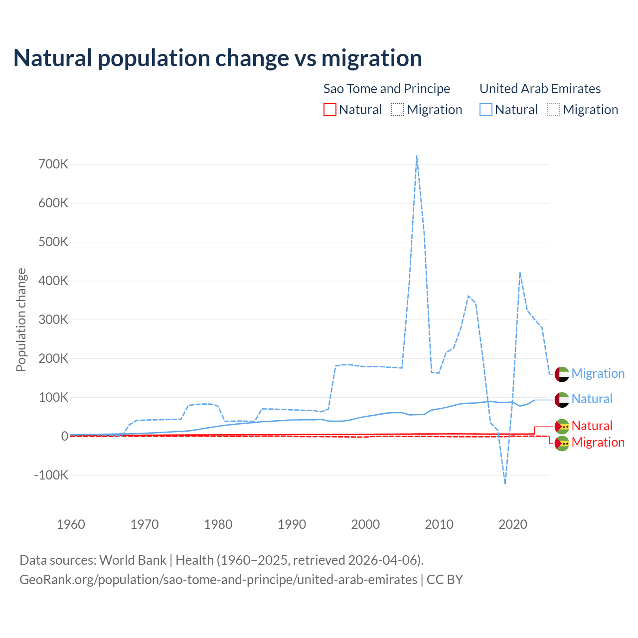 Over the last 10 years, 80.1% of the population change in Sao Tome and Principe is from natural causes (a gain of 50,822 people) and 19.9% is from migration (a loss of 12,621 people). In the United Arab Emirates 30.5% is from natural causes (a gain of 857,996 people) and 69.5% is from migration (a gain of 1,958,520 people).