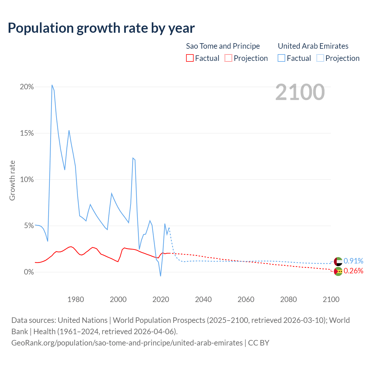 - For the last 10 years, Sao Tome and Principe has had an average growth rate of +1.82% per year vs +3.31% in the United Arab Emirates.
