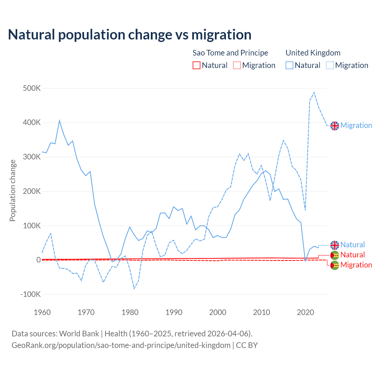Over the last 10 years, 80.1% of the population change in Sao Tome and Principe is from natural causes (a gain of 50,822 people) and 19.9% is from migration (a loss of 12,621 people). In the United Kingdom 23.9% is from natural causes (a gain of 1,033,129 people) and 76.1% is from migration (a gain of 3,283,101 people).