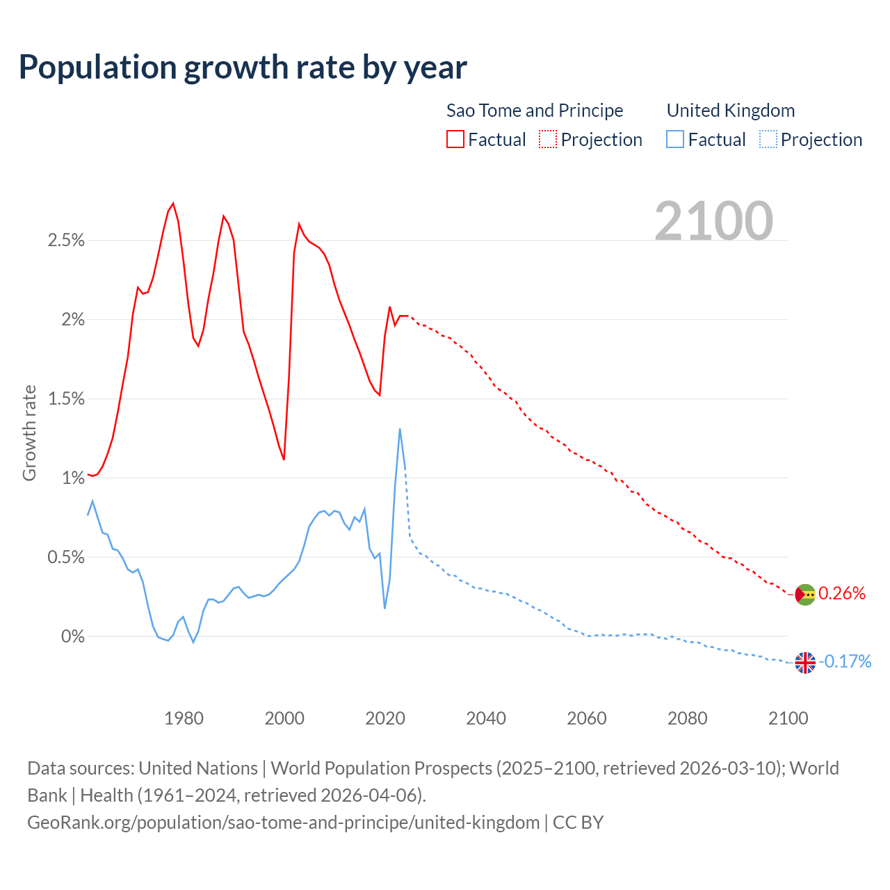 - For the last 10 years, Sao Tome and Principe has had an average growth rate of +1.82% per year vs +0.7% in the United Kingdom.