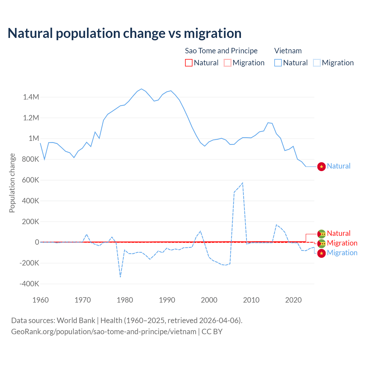 Over the last 10 years, 80.1% of the population change in Sao Tome and Principe is from natural causes (a gain of 50,822 people) and 19.9% is from migration (a loss of 12,621 people). In Vietnam 97.7% is from natural causes (a gain of 9,349,756 people) and 2.29% is from migration (a gain of 219,073 people).