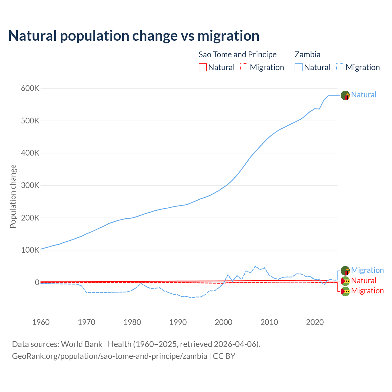 Over the last 10 years, 80.1% of the population change in Sao Tome and Principe is from natural causes (a gain of 50,822 people) and 19.9% is from migration (a loss of 12,621 people). In Zambia 97.4% is from natural causes (a gain of 5,233,797 people) and 2.58% is from migration (a gain of 138,554 people).